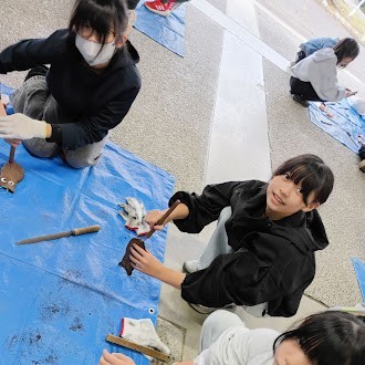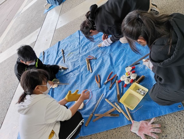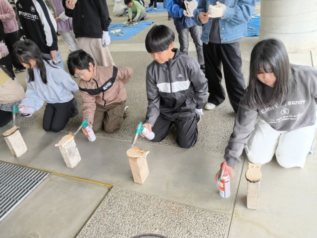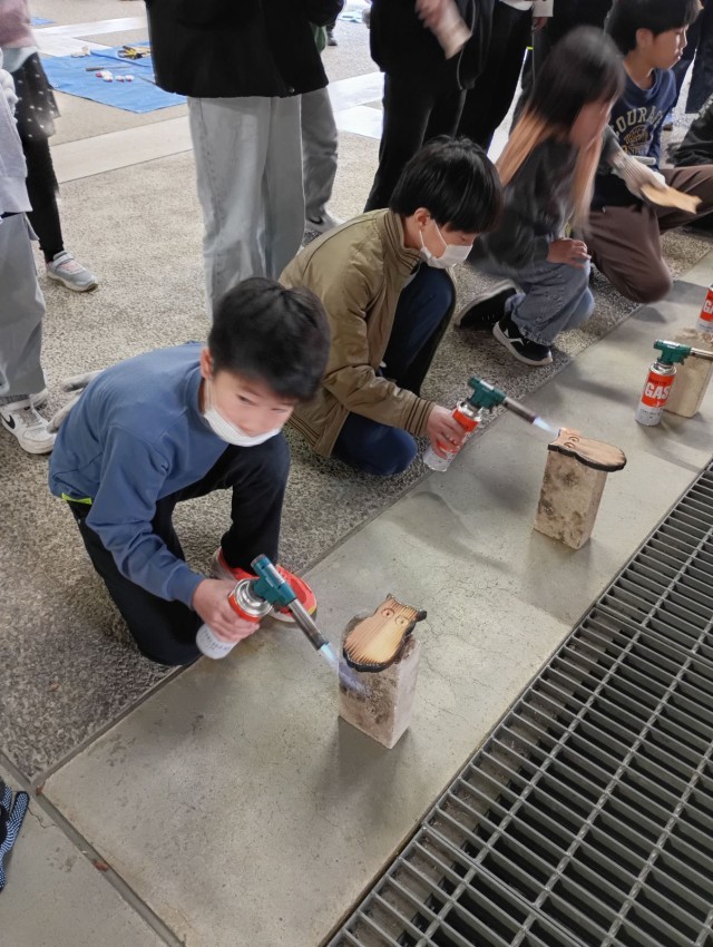 5年生 +4 焼杉工作の様子です。 やすりで磨いて、バーナーで焼いて、金具を付けて・・・ 自分だけの作品を作りましょう!