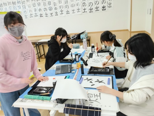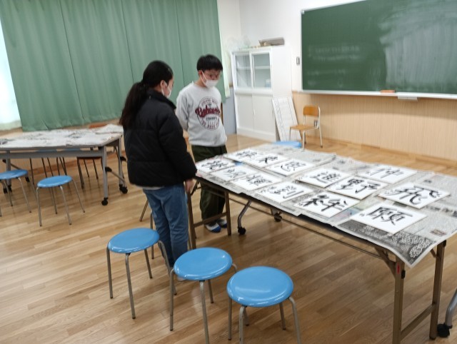 書道科講師の先生にアドバイスを頂きながら、久しぶりの書初めを楽しんでいました。
