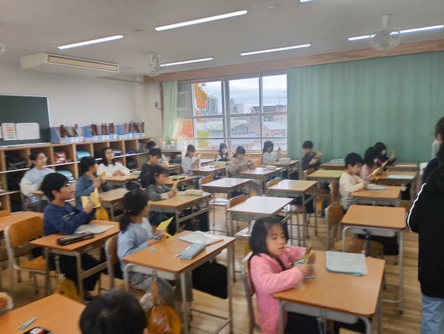 11月15日(木)、明日のいちょうまつりに向けて、最後の準備をしました。5時間目は全校で、店番の時間とゲーム屋さんのまわり方の確認をしてから、ポスター作りや飾り付けをしました。6時間目は4〜6年生で、会場作りを行いました。