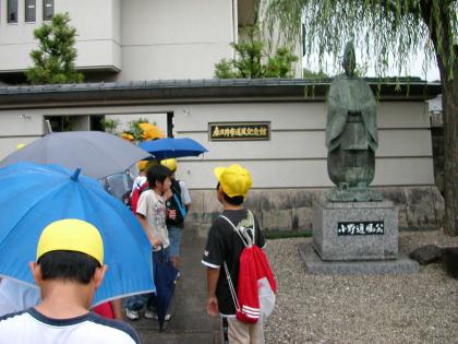 総合書写の一環で、校区にある道風記念館へ行きました。小野道風が書いた書の複製や、現代の書家の作品などを鑑賞し、文字のバランスや続け方、墨の濃淡など様々な工夫を知ることができました。