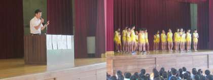 続いて、2年生の代表児童が1学期の反省と夏休みの生活についての発表をしました。また、生徒指導の先生からは「つみきおに」についてのお話などがありました。