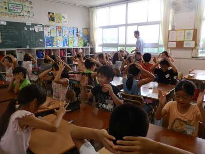 動物の名前を英語で覚え、ベル先生の言う単語を聞きとって、ペアで消しゴムを取り合うゲームをしました。ゲームの中でも繰り返し単語を話し、発音を練習しました。