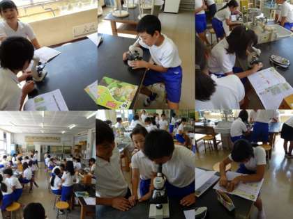 前もって採ってきたヘチマの花粉を、顕微鏡で観察しました。2回目とあって、顕微鏡の扱い方にも慣れてきたようです。