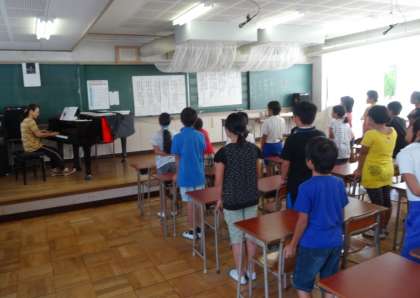 音楽の授業で歌っている様子です。5年生は、リコーダーのテストも行っています。夏休みに練習をして、とても上手に吹けるようになっていて、驚きました。