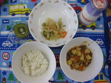 今日の給食は、麦ごはん 牛乳 マーボ豆腐 寒天サラダ キウイフルーツでした。