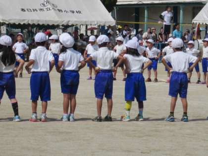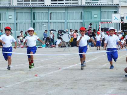 1年生の運動会の種目は、「かけっこ」と「玉入れ」です。「かけっこ」は,太鼓の合図でスタートです。直線40メートルをかけぬけました。