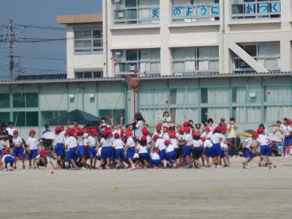 「玉入れ」は、「ちぇっ ちぇっ こり」の音楽に合わせて,ダンスを行い、曲の間奏で玉入れをしました。元気いっぱい頑張りました。