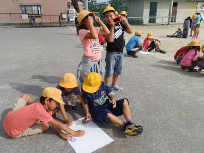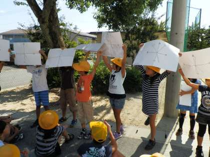 理科の学習で、太陽とかげの向きの関係を調べました。遮光プレートを使って太陽を見たり、方位磁針で方位を確認したり、影をスケッチしたり、みんなで声をかけ合って観察しました。