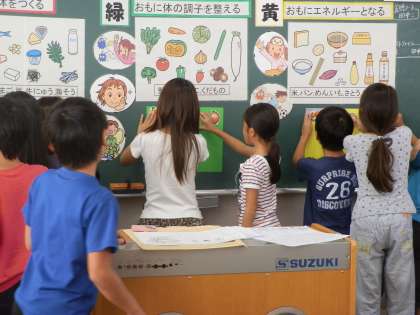 さまざま食べ物が「赤」「黄」「緑」のどの栄養群に入るのか知り、給食で使われている食材も分けてみました。