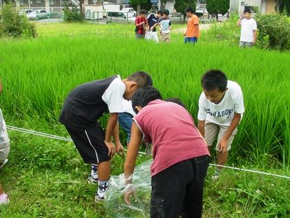 7月31日の出校日、5年生は稲の観察と草取りを行いました。稲は約70cmの長さで、片手でつかめないほど太く、しっかりと生長していました。周りの雑草も一緒に生長していたので、草取りは大変でした。