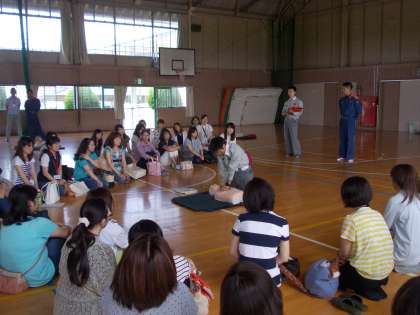 7月2日(木)、第3回ふれあい教育セミナーとして、保護者対象の「救急法講習会」を行い、心肺蘇生法とAEDの扱い方について指導を受けました。