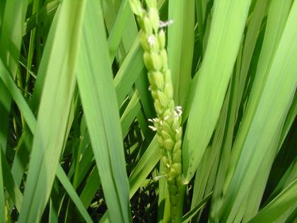 田んぼの稲に穂が出て、花が咲きました。昨年よりも2週間ほど遅いですが、これからの成長が楽しみです。