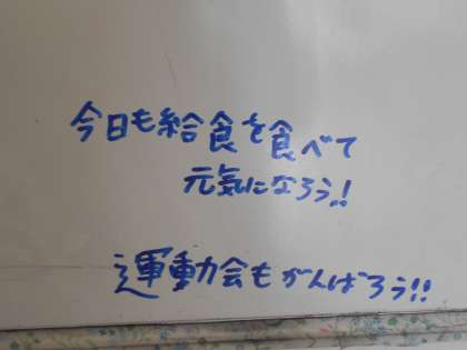 2枚目の写真は、給食委員会が作成している食育掲示板の写真です。今日担当した児童が書いたメッセージを紹介します。明日運動会実施できるとよいですね。