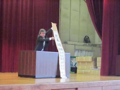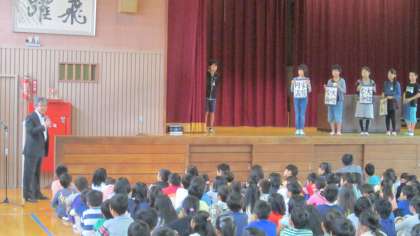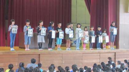 10月17日(月)の朝会の後、児童会の司会による席上揮毫大会代表選手の紹介と激励会が行われました。