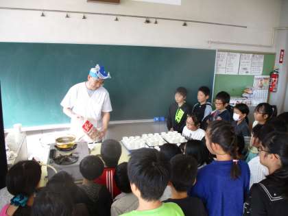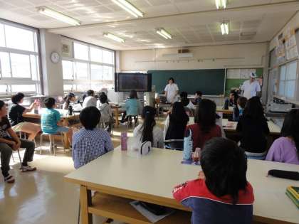 1時間目には、味覚には酸味、塩味、甘味、苦味、うま味の5つがあり、その中のうま味を感じるために、だしの飲み比べをしました。最初はかつおだしより、顆粒だしの方がおいしいと言っていた子どもたちですが、醤油を足して飲んでみると、かつおだしの方がおいしいと変わっていました。