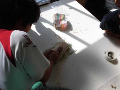 2時間目には、かつおぶしの削り体験、にぼしのだしをとるために頭や内臓を取り除く作業や、だしをとる昆布や干椎茸などの説明と、グループごとに分かれて活動しました。