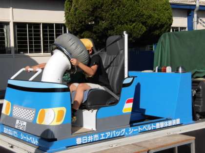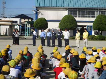 10月26日(水)に警察の交通課の方々に来ていただき、交通安全教室を行いました。横断歩道の渡り方の説明と時速7キロメートルで走った際のシートベルト衝撃体験を楽しく学ぶことができました。