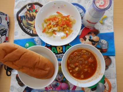 今日の給食は、ミルクロールパン 牛乳 ポークビーンズ コーンサラダ 干し小魚でした。