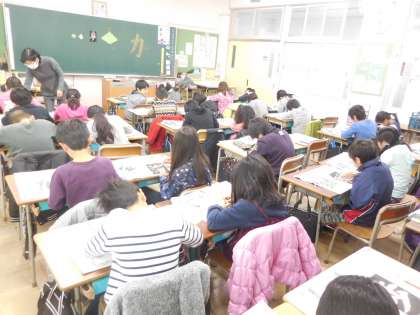 1月13日(金)、本多まり子先生をお迎えして、書作品制作の第2回目を行いました。本多先生から本時の作業内容を丁寧に説明していただき、先生が作ってきてくださった作品を何点か見せていただきました。