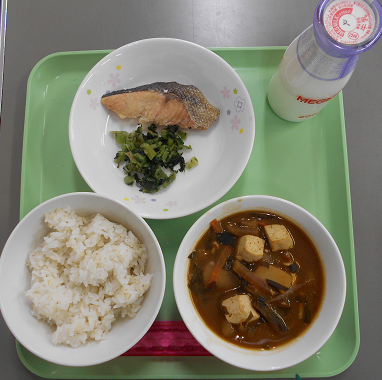 今日の給食は、麦ご飯 牛乳 みそ汁 さけの塩焼き 野沢菜漬け でした。