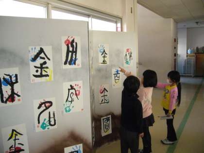 手形を押した用紙に、1年生で習う漢字の元の形の文字を書きました。それを段ボール製の屏風に貼り付けました。