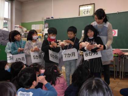 お母さんのお腹の中の大きさの人形や生まれてからの大きさの赤ちゃんの人形を抱いて、成長の様子を実感しました。
