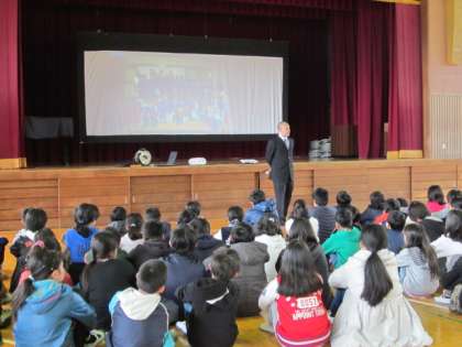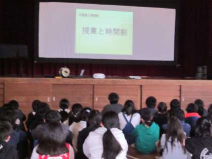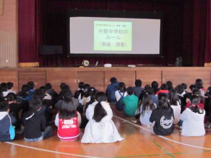 中部中学校から先生がみえて、中学校についてのビデオとお話をしていただきました。
