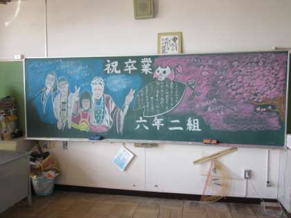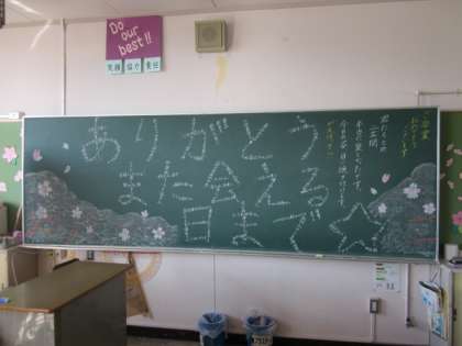 子どもたちが帰った後の静かな教室で、3名の担任が、夜遅くまでかけて各教室の黒板にメッセージを描きました。