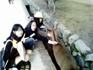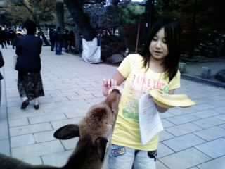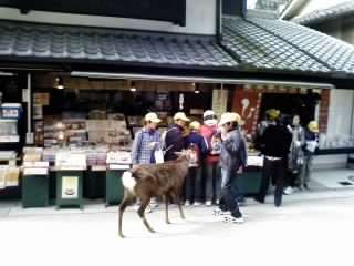 食後はお土産タイムと鹿の餌やりです。鹿に取り囲まれて泣いている子もいました。