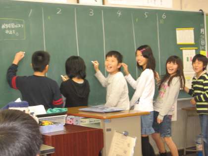 26日(木)、5時間目に5年3組で英語の授業を行いました。平成23年度から学習指導要領が変わり、高学年で外国語の学習が始まります。今日は他の学年の先生方が英語の授業の様子を参観したり一緒にゲームをしたりしました。