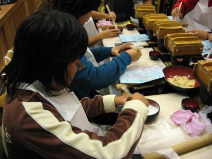 今年の修学旅行では「体験活動」を取り入れました。奥村さんは「八つ橋」作り、楠本さんは「野菜饅頭作り」を楽しみました。続いて出かけた金閣寺は太陽に照らされとてもきれいでした。