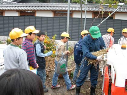 11月20日、お米の脱穀をおこないました。松河戸の加藤さんのお宅へ伺い、足踏み脱穀機での脱穀体験と機械による脱穀・もみすりの見学をさせていただきました。「足で踏むだけなのにつかれた」、「稲を持っていたら、手が引きずり込まれそうなほど、中で回転しているものの力が強かった」など、とてもいい体験をすることができました。最後に、お茶とサツマイモまでいただきました。ありがとうございました。