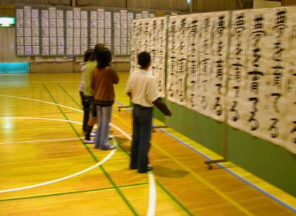 個人懇談会中,体育館に全校児童の作品が展示してあります。自分の作品をさがしたり,きょうだいや友達の作品を見たりして思い思いに鑑賞をしていました。