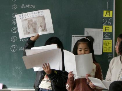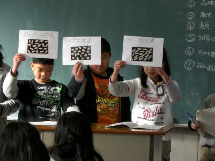 グループごとに研究した内容の発表会を行いました。田んぼにいる害虫や品種改良の方法,昔の米作りに使われた道具などを調べて発表していました。3時間目に残りのグループの発表を行います。