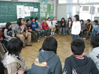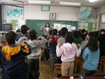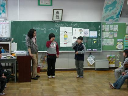 今回の授業は「病院」をテーマにして行いました。doctor,nurse,ambulanceなどの単語を練習した後、医者と患者の役になって会話練習をしました。その後、2チームに分かれて早押しゲームをしたり、「痛みバスケット」などを行ったりしました。会話文が難しかったようですが、ゲームをしていくうちにだんだん大きな声が出るようになってきました。