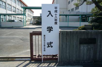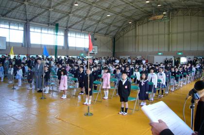 本日4月6日、132名の新1年生児童が入学しました。今年は、入学式に続いて、「黄色い帽子と防犯用ホイッスルの贈呈式」も行いました。春日井市の助役様や警察署長様、教育長先生、校長先生から一人ひとりの児童に帽子とホイッスルが配られました。