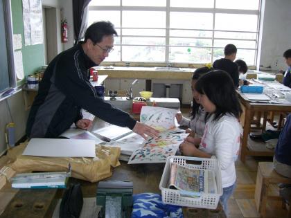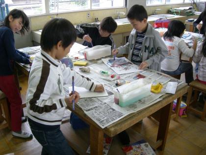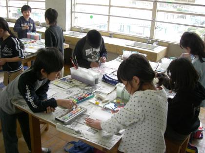 今年の図工は、昨年算数でお世話になった川越先生と一緒に行います。デカルコマニー、ドリッピングという技法を使って色の重なりや模様の不思議さを感じながら取り組むことができました。