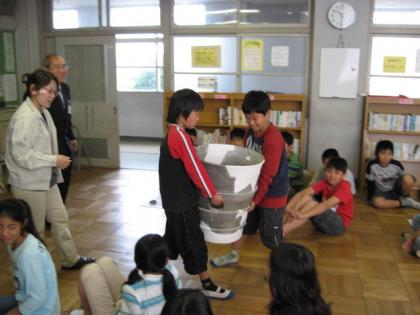 次に土器などを時代順に並べ替えるクイズをしました。社会の授業で学習したことや文化財課の方の説明をもとに、グループごとに話し合いながら行いました。その後、代表の子が大きな円筒埴輪を持ってすべてのグループをまわり、みんなで埴輪の手触りを確かめました。