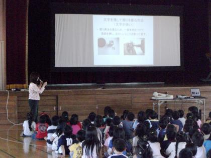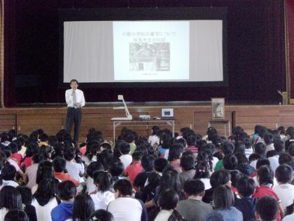 5時間目、3年生から6年生が体育館に集まって校長先生から小野道風についてのお話と、納谷先生から消しゴムで落款を作ることのお話を聞きました。