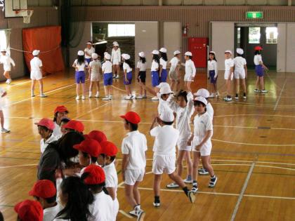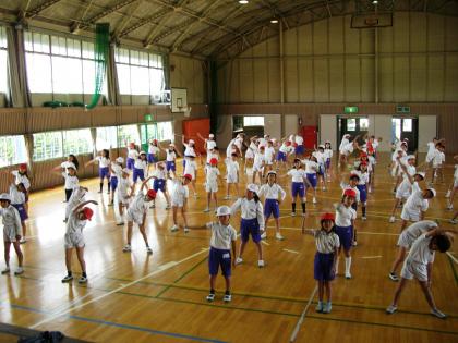 今日は雨でしたが、体育館でラジオ体操と長縄跳びを行いました。