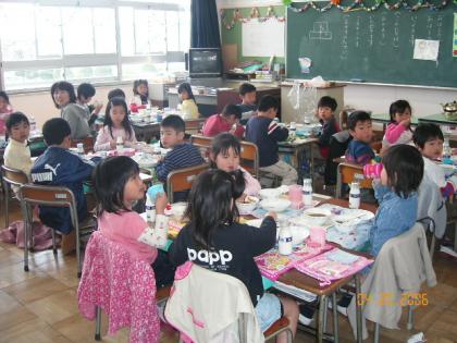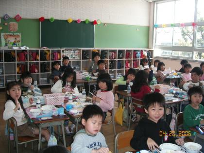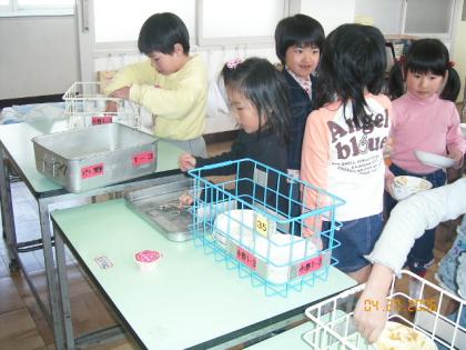いよいよ1年生も給食が始まりました。最初の給食は大好きなカレーでした。みんないっぱいおかわりしておいしくいただきました。当番の仕事も力をあわせてがんばりました。