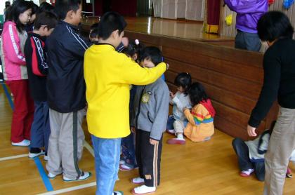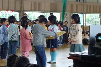 今日は,2年生から6年生のお兄さん・お姉さんたちに「1年生を迎える会」を開いていただきました。歌や演技,スライドによる学校紹介,クイズなど楽しい時間を過ごしました。これから1年間お世話になる,6年生のお兄さん・お姉さんからは「おめでとう」のメダルを首からかけてもらい,うれしそうでした。また,2年生からは,「あさがおの種」をもらったのでお家で一緒に育ててみてください。