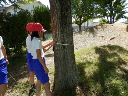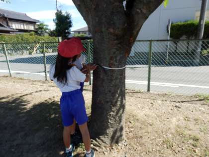 算数の「時間と長さ」の単元の「まきじゃくを使って」の時間に校庭で自分の好きな物の長さを測りました。グループで仲良く協力して巻尺をつかって木の周りや遊具の高さなどを測っていました。1mより長いものや木の周りなど曲がっているものの長さを測る場面で巻尺を使うと便利であることに気付くことができました。