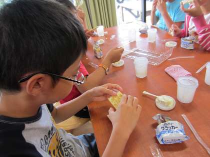 乳牛の乳しぼりやバター作りは,初めての経験です。牛のお乳の暖かさや柔らかさにびっくりし,シャカシャカ振ってコロコロするだけで,おいしいバターができあがることに感動していました。