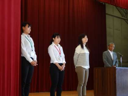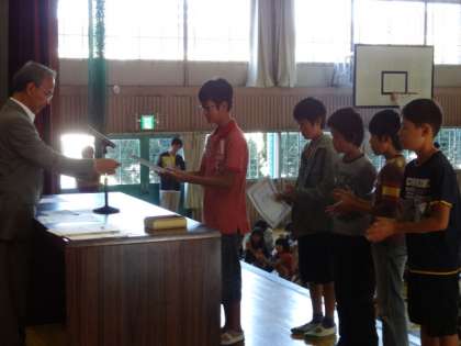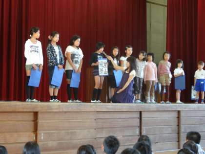 10月15日(月)今日の朝会は児童会執行委員・学級委員・委員長の認証式を行いました。これから後期の児童会行事や学級活動の中心となってがんばっていってくれます。みんなで協力していきましょう。次に講師の先生や教育実習の先生の紹介も行いました。最後に児童集会に移り、10月27日に本校で行われる席上揮毫大会の選手の紹介及び激励会を行いました。選手一人一人が自分の目標を発表しました。