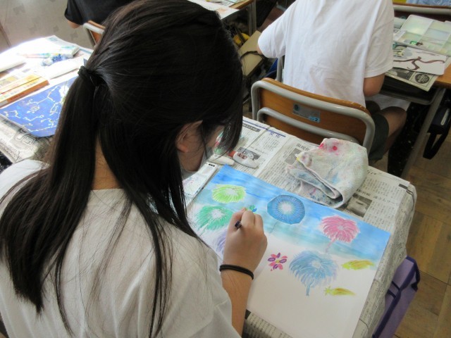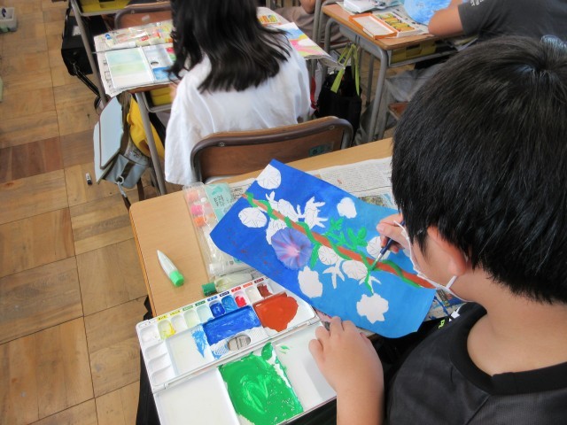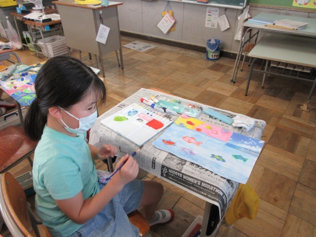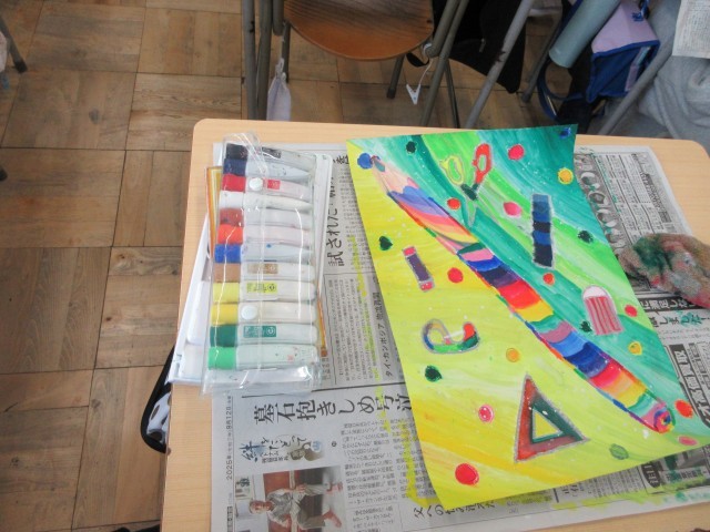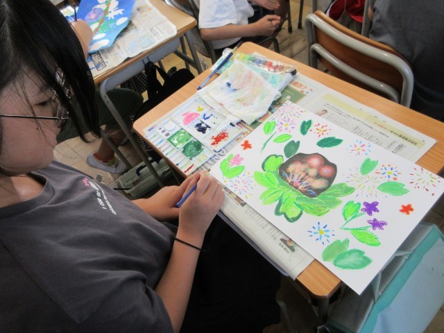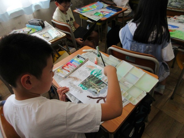 5年生の授業のようすです。図工では「まだ見ぬ世界」の作品作りをしています。いよいよ下書きから絵の具へ入りました。色がつくと、みんなが想像した鮮やかな世界がさらに広がっていきますね。