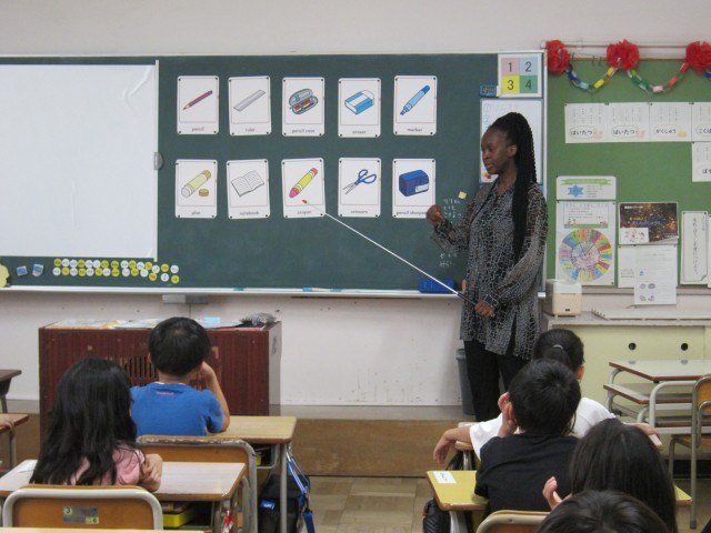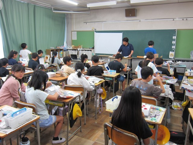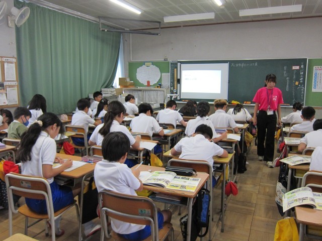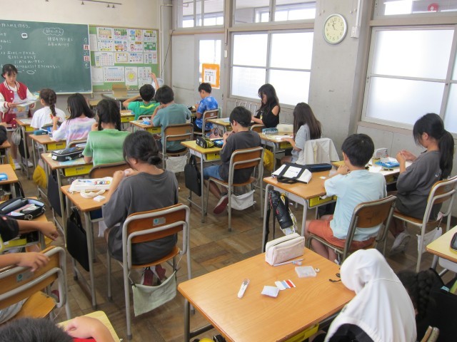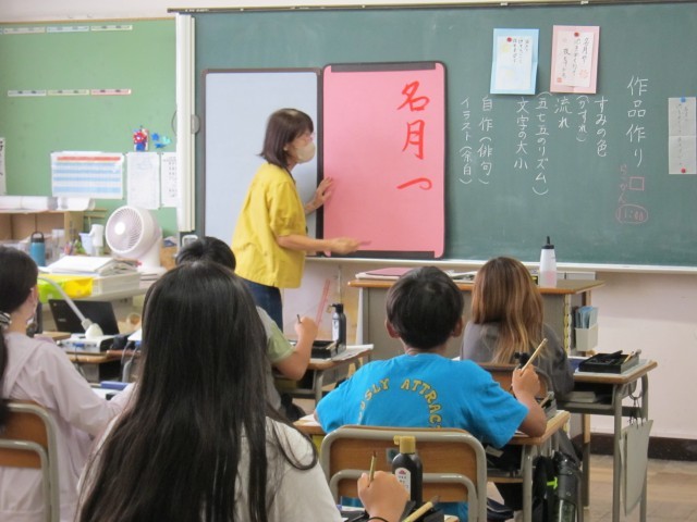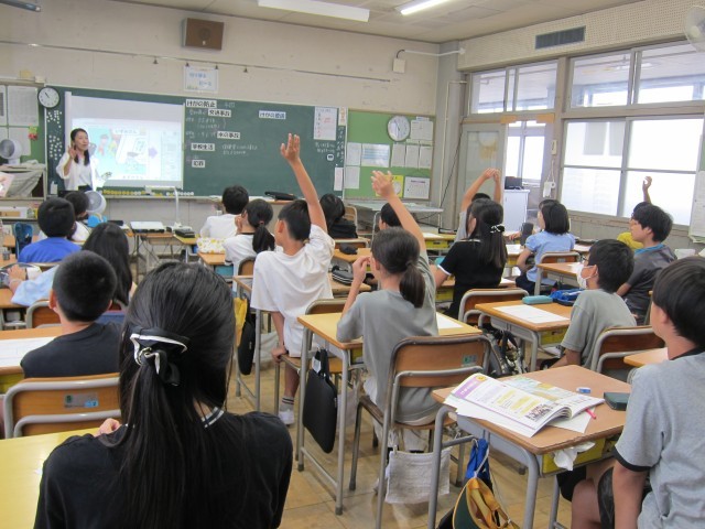 今日は1年生の授業にALTの先生、6年生の授業に書道科講師の方がそれぞれ来校し、専門的な指導をしてくださいました。