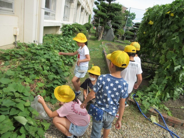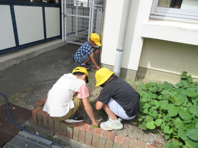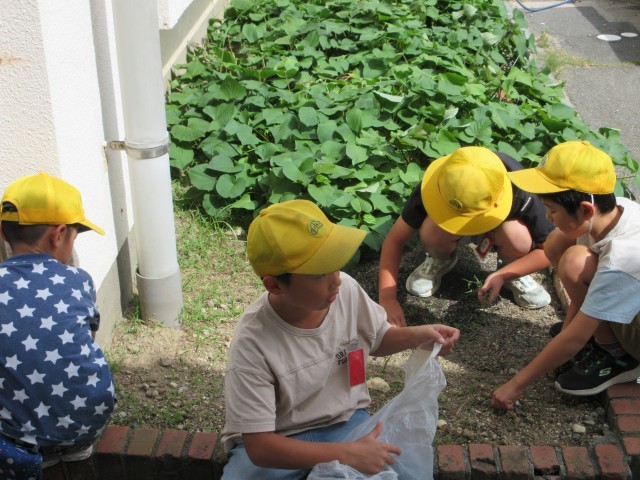 本館と南館の間の外掃除の様子です。さつまいもを植えているところを苗と雑草を分けながら草抜きをしています。お陰でさつまいもがすくすく大きくなっています。