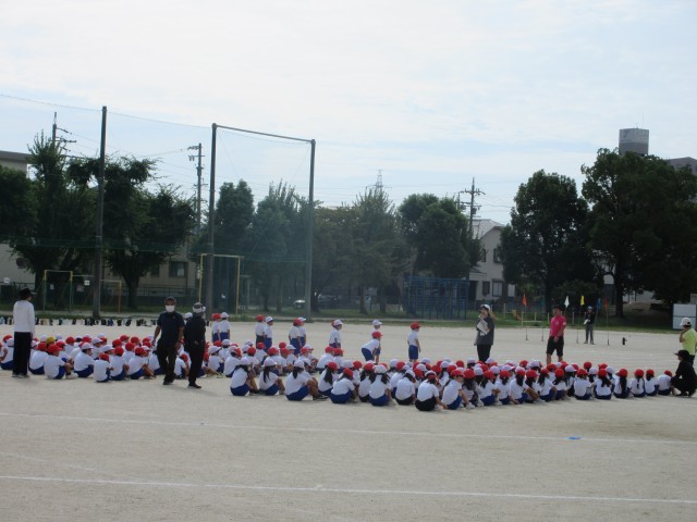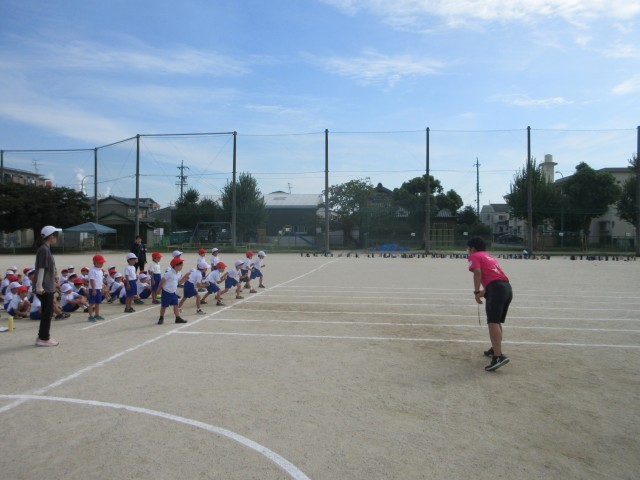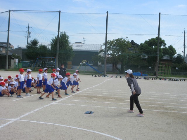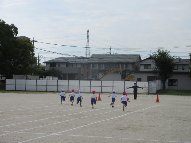 1年生の運動会練習の様子です。かけっこの並び方をやってみました。その後実際に走ってみました。「位置について、ヨーイドン」ゴールの後ろにある赤いコーンまで走り抜けるように、みんながんばっています。