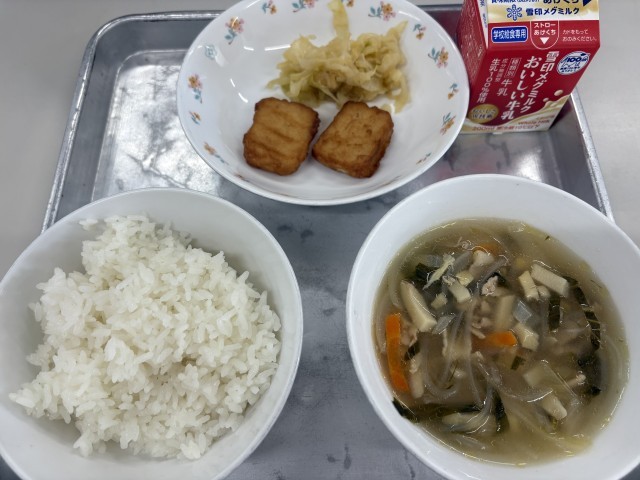 今日の給食は、ごはん、牛乳、春雨スープ、豆腐ナゲット、キャベツのあえものです。春雨スープにチンゲン菜が入っていたのですが、実はチンゲン菜は秋が旬の野菜です。最近はいろいろな野菜が年中スーパーに並んでいるのでわかりにくいですが、旬の味を楽しめるといいですね。